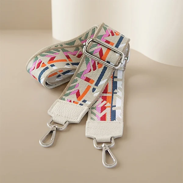 Φαρδύς ιμάντας τσάντας με πολύχρωμο γεωμετρικό σχέδιο, ιδανικός για να ανανεώσει το στυλ της αγαπημένης σου τσάντας. Κατασκευασμένος από ανθεκτικό ύφασμα, προσφέρει άνεση στη χρήση, ενώ τα δερμάτινα τελειώματα ενισχύουν τη σταθερότητα και την αντοχή στα σημεία σύνδεσης.