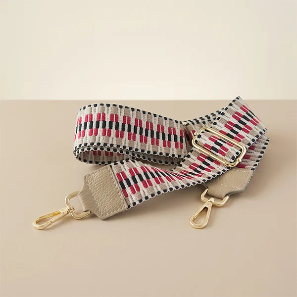 Φαρδύς ιμάντας τσάντας με πολύχρωμο γεωμετρικό σχέδιο, ιδανικός για να ανανεώσει το στυλ της αγαπημένης σου τσάντας. Κατασκευασμένος από ανθεκτικό ύφασμα, προσφέρει άνεση στη χρήση, ενώ τα δερμάτινα τελειώματα ενισχύουν τη σταθερότητα και την αντοχή στα σημεία σύνδεσης.