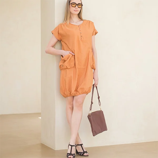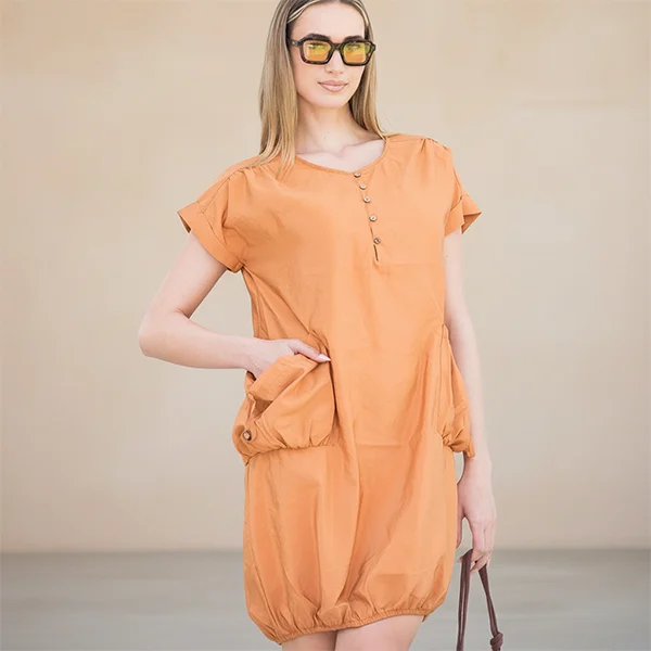 Φόρεμα μίνι σε χαλαρή γραμμή, ιδανικό για άνετες και κομψές εμφανίσεις όλη την ημέρα. Διαθέτει κοντά μανίκια και στρογγυλή λαιμόκοψη με διακοσμητικά κουμπιά στο μπροστινό μέρος. Η ανάλαφρη υφή του υφάσματος προσφέρει δροσερή αίσθηση, ενώ το λάστιχο στο τελείωμα δημιουργεί ένα μοντέρνο balloon εφέ. Πρακτικές τσέπες στο πλάι προσθέτουν λειτουργικότητα και στυλ.