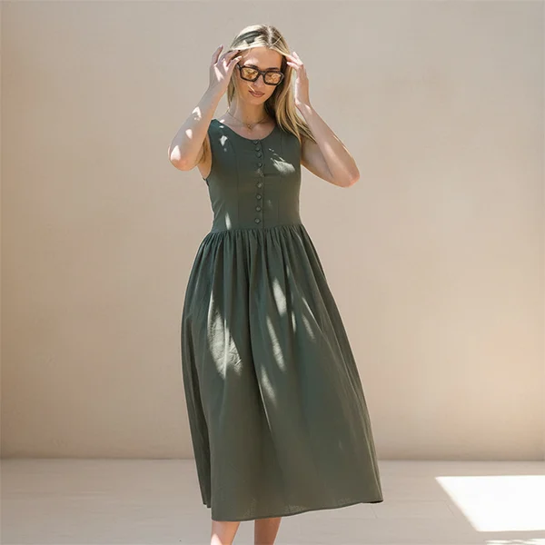 Η αμάνικη γραμμή και η απαλή, αέρινη υφή του υφάσματος το καθιστούν ιδανική επιλογή για ζεστές ημέρες, ενώ τα διακοσμητικά κουμπιά στο μπροστινό μέρος προσθέτουν μία διακριτική θηλυκή πινελιά.