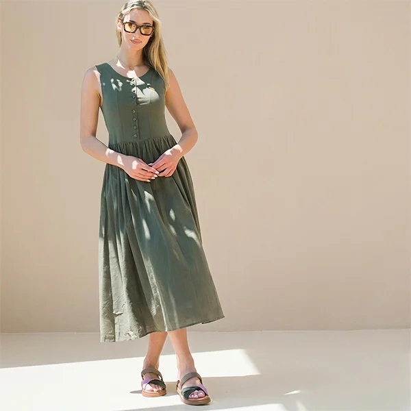 Η εφαρμογή του αγκαλιάζει το σώμα στο επάνω μέρος και ανοίγει σε ελαφριά Α-γραμμή από τη μέση και κάτω, προσφέροντας κίνηση και άνεση σε κάθε βήμα. Το φυσικό χακί χρώμα το καθιστά εύκολο στους συνδυασμούς, από καθημερινές εμφανίσεις μέχρι πιο προσεγμένα looks.